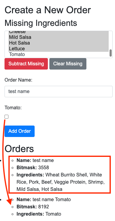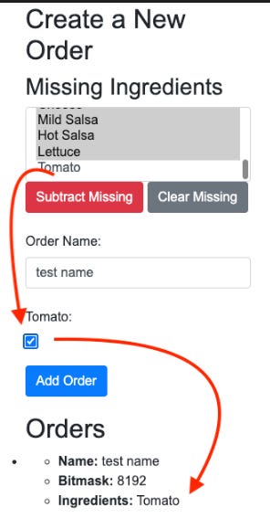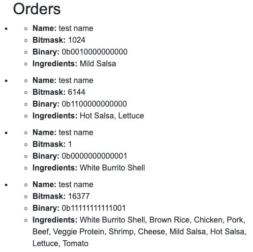 In the Burrito Ordering System, the BurritoOrder class uses bitmasks to keep track of the ingredients selected for each order. This method provides a compact representation of the order and allows for quick checking and retrieval of the selected options. The encoded bitmask is stored alongside the order name, enabling the system to effectively manage and display the orders. Everything happens in the browser; the orders do not persist. Refresh the page to clear the lists.